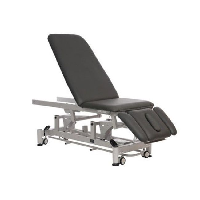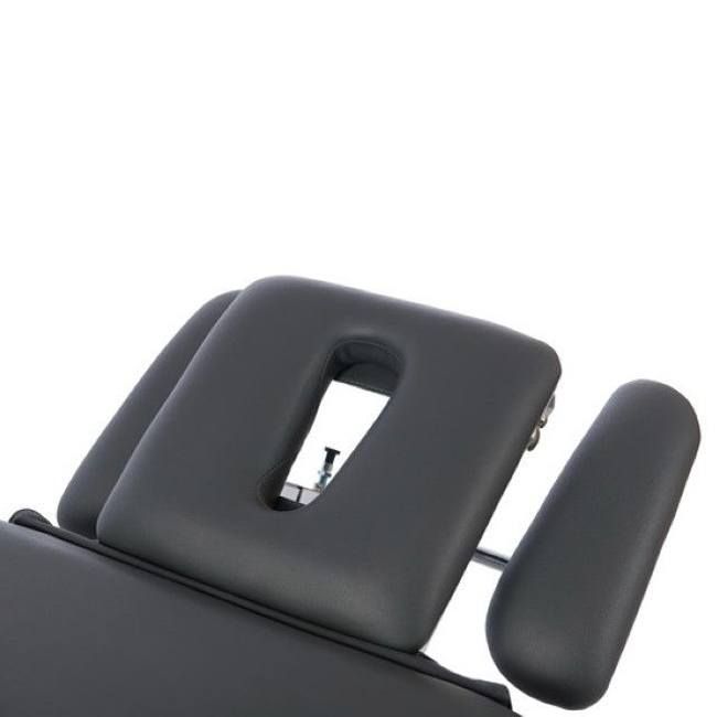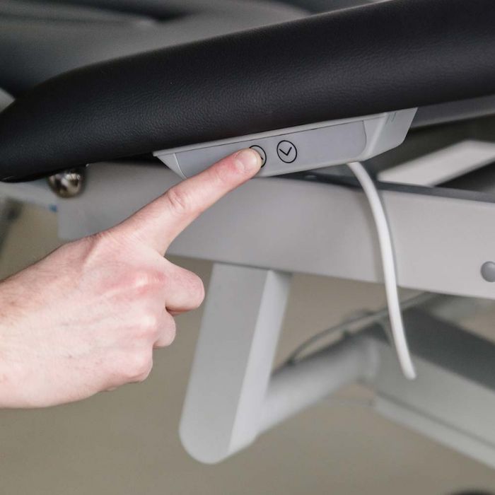 La table de traitement Z-essential à 5 sections est une table de traitement de haute qualité pour les traitements de physiothérapie. La table se compose de 5 parties et possède une tête, une partie centrale et une partie pour les pieds mobiles. Les accoudoirs sont réglables par paliers. La table est dotée d’une fonction de drainage postural (fonction pli) qui permet de relever la partie centrale de la table. La table de traitement est équipée de deux moteurs : l’un pour la fonction pli et l’autre pour lever et abaisser la table. Le réglage de la hauteur de la table s’effectue à l’aide de la commande au pied.