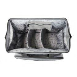 - Une poche ventrale (40×20 cm) s’ouvre complétement avec d’un côté 2 filets de rangements zippés et 2 poches plates, et sur l’autre face plusieurs boucles élastiques qui permettent de ranger les petites fournitures de soins : pinces, ciseaux, lampe-stylo, thermomètre, bandages, stylos, etc…