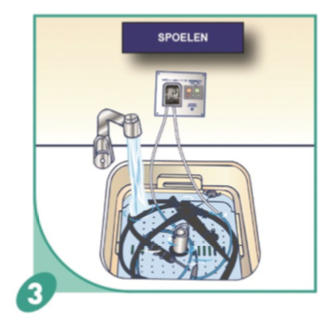 Nadien het medisch hulpmiddel of de instrumenten zorgvuldig afspoelen met leidingwater (van goede micro-biologische kwaliteit).