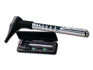 Penlight in metaal met LED lampje – converteerbaar naar mini-otoscoop: geleverd in harde etui met 3 specula en 2 AAA batterijen