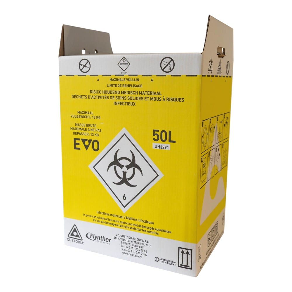 tot weigering bij inlevering. De Medibox is gemaakt van dubbelzijdig golfkarton (4 mm dik) en is voorzien van een gele PEBD-binnenzak, automatische bodem, duidelijke
