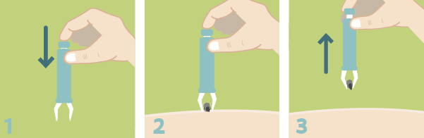 Een tekentang wordt gebruikt om bij zowel mensen als (huis)dieren teken te verwijderen. Grijp de teek onder de kop vast met de tang (dus zo dicht mogelijk bij de huid), en trek de teek recht omhoog uit de huid.