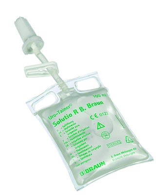 - Breng de vloeistof op lichaamstemperatuur door het zakje ± 15 min in een bak handwarm water te leggen.
