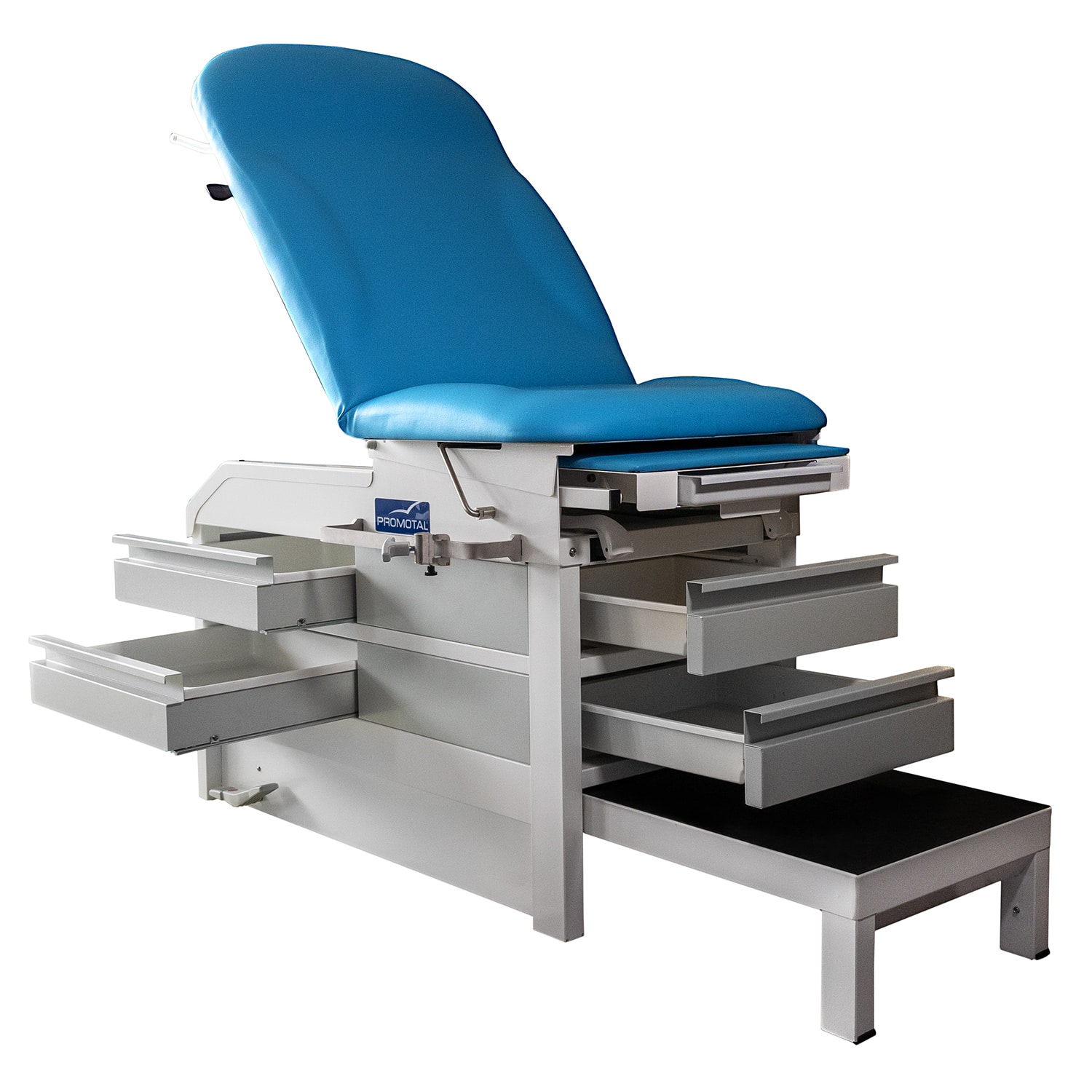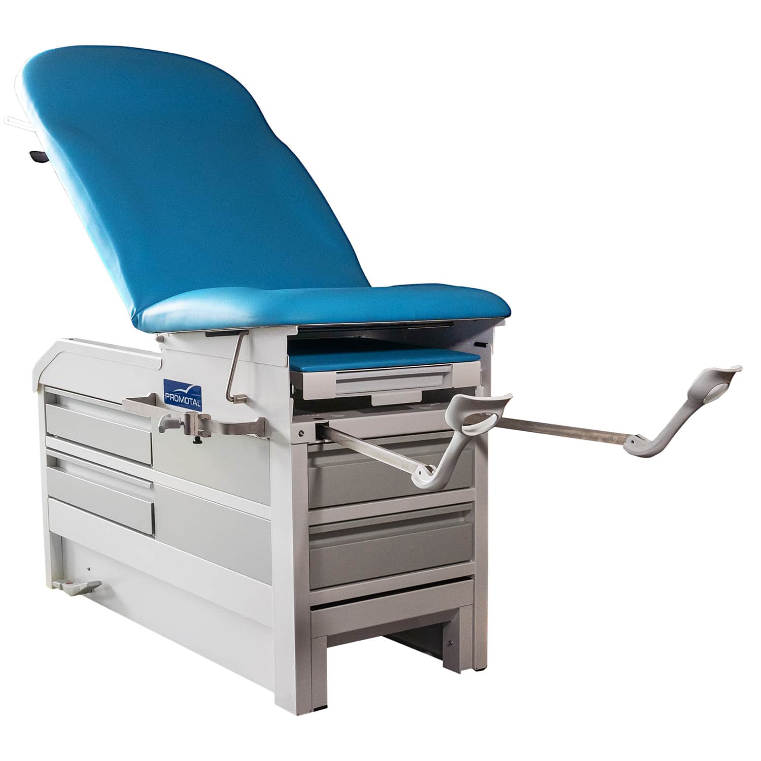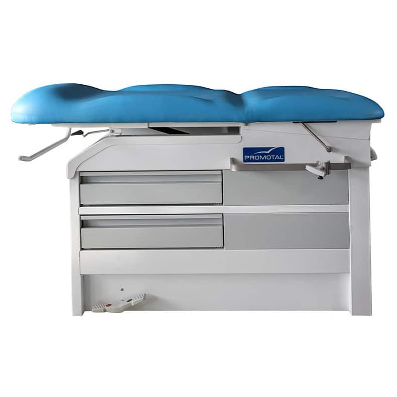 Voer uw onderzoeken gemakkelijker uit door een comfortabele zithouding (vertegenwoordigt 80% van de examens), 4 Lades om alles wat je nodig hebt binnen handbereik te houden, 2 doorschuifbare zijladen, van beide kanten toegankelijk (waardoor je de tafel in het midden van de examenruimte kunt plaatsen), 2 Lades vooraan, geïntegreerde intrekbare stijgbeugels & bekkenkanteling (7 graden)
