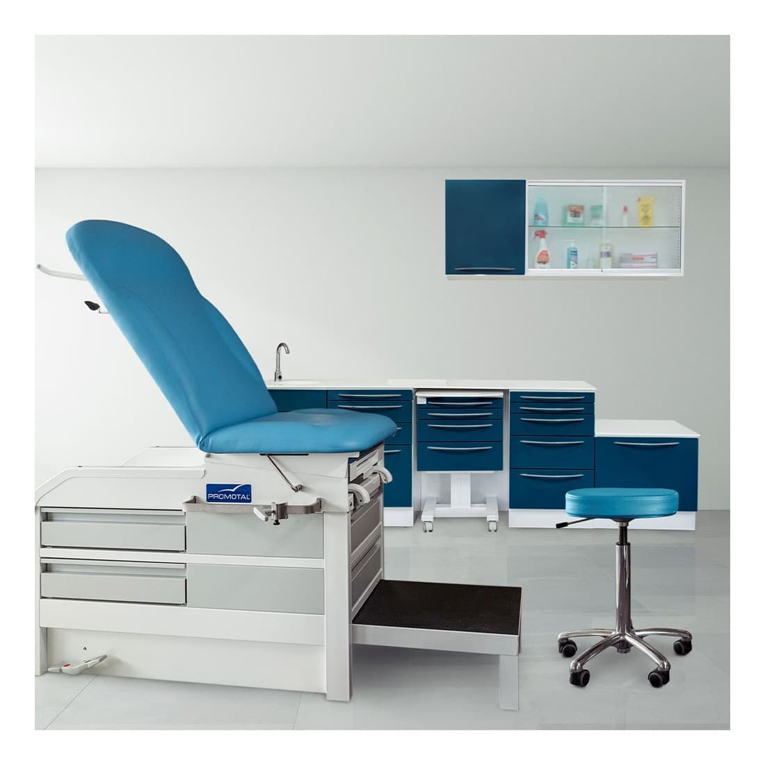 Laden uit één stuk gemaakt van gemakkelijk te reinigen abs. Verwijderbare bekleding. Alle oppervlakken zijn gemakkelijk toegankelijk om te reinigen. Een papierrolhouder met grote capaciteit geïntegreerd in de rugleuning, maximale lengte 50 cm – ∅20 cm. Een verwijderbare, steriliseerbare abs-gynaecologielade.