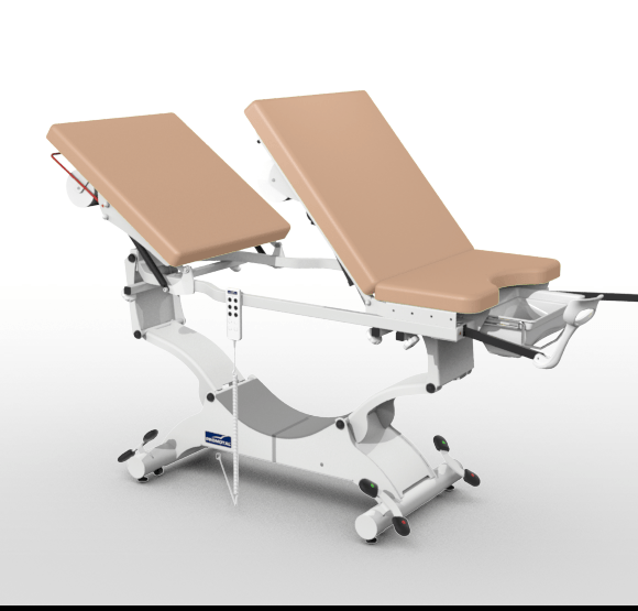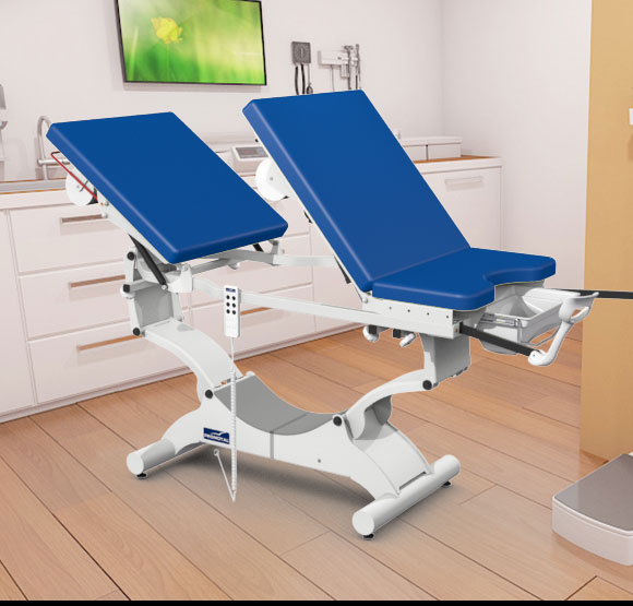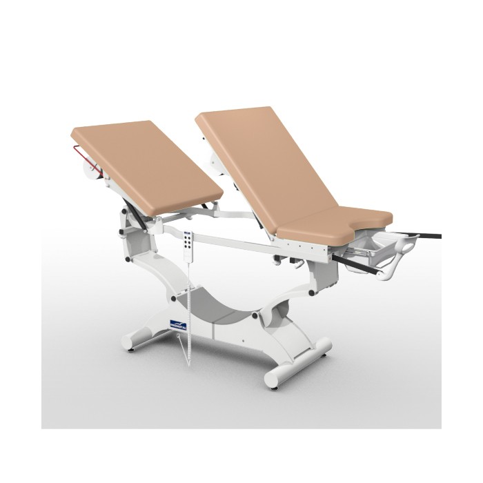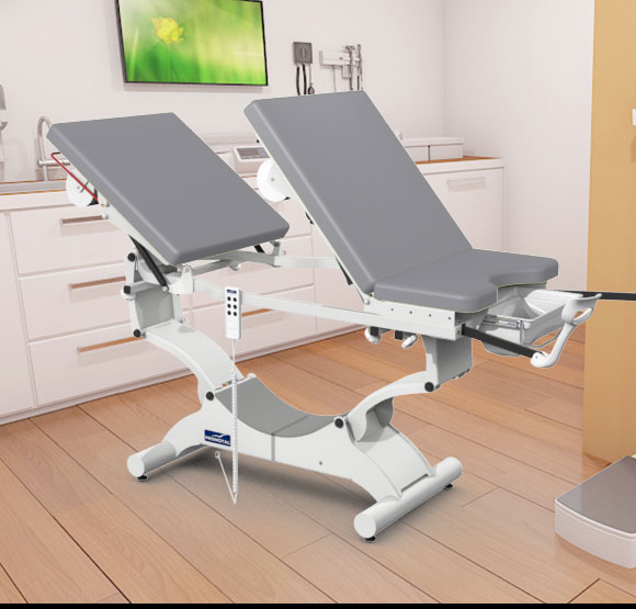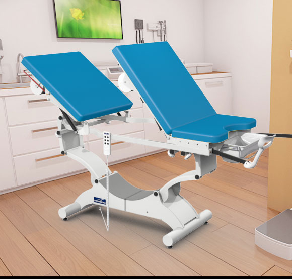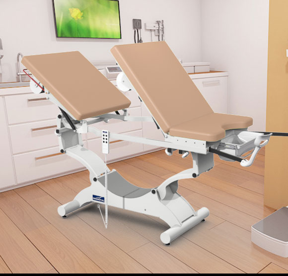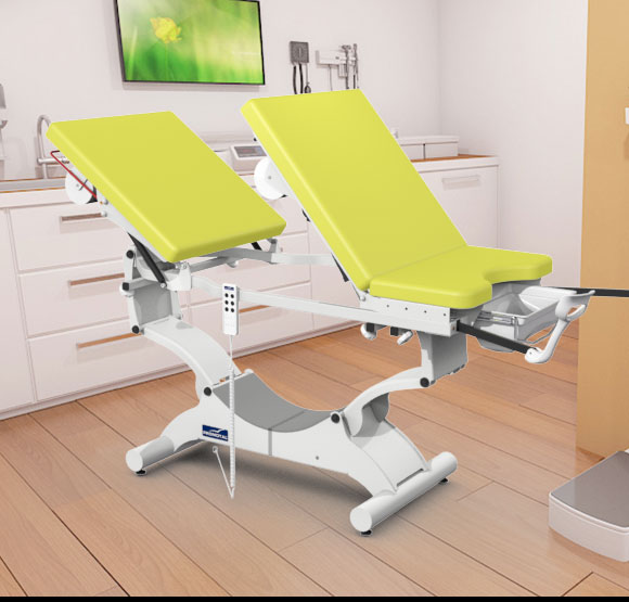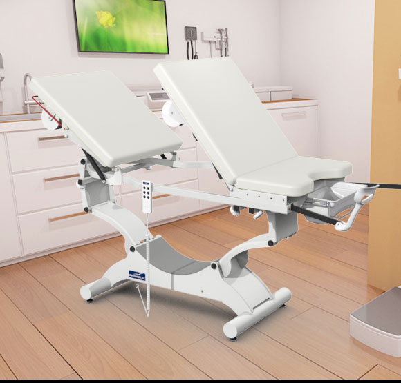 De elektrische onderzoekstafel is in de hoogte verstelbaar, waarvan het centrale gedeelte aan de achterkant omhoog kan gebracht worden om de onderzoekstafel om te vormen tot een gynaecologische onderzoekstafel.