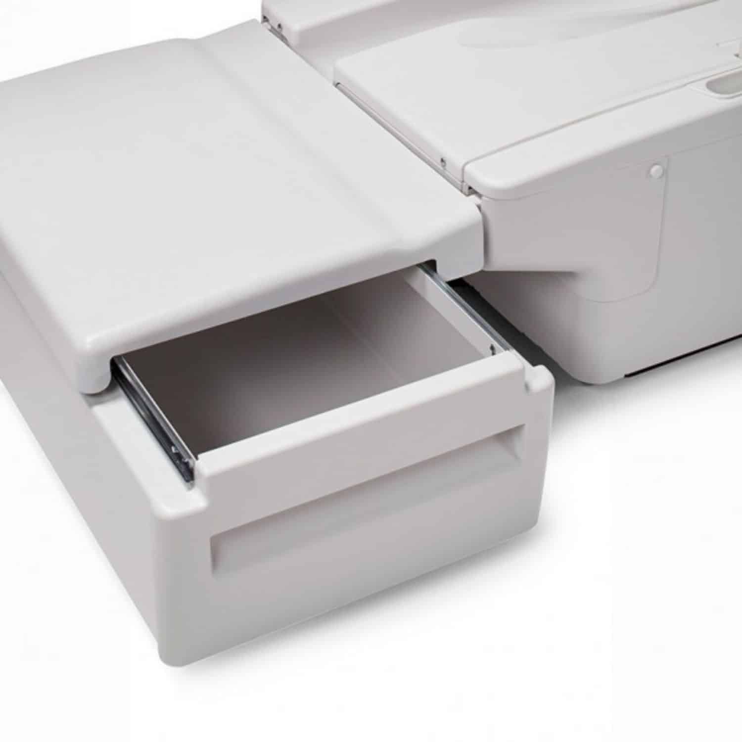 De papierrolhouder is geïntegreerd in de rugleuning. Het onderzoekstafelpapier blijft op zijn plaats met een riem.