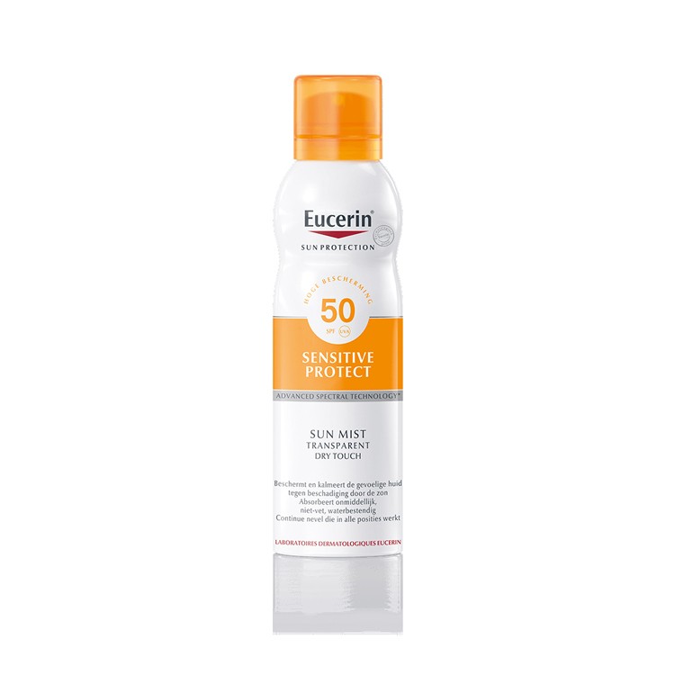 Eucerin Sun Mist Spray Transparent Dry Touch Sensitive Protect is waterbestendig, niet vet en plakt niet.