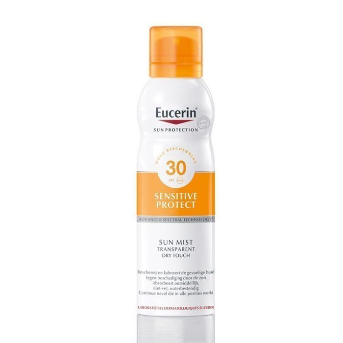 Eucerin Sun Mist Spray Transparent Dry Touch Sensitive Protect is waterbestendig, niet vet en plakt niet.