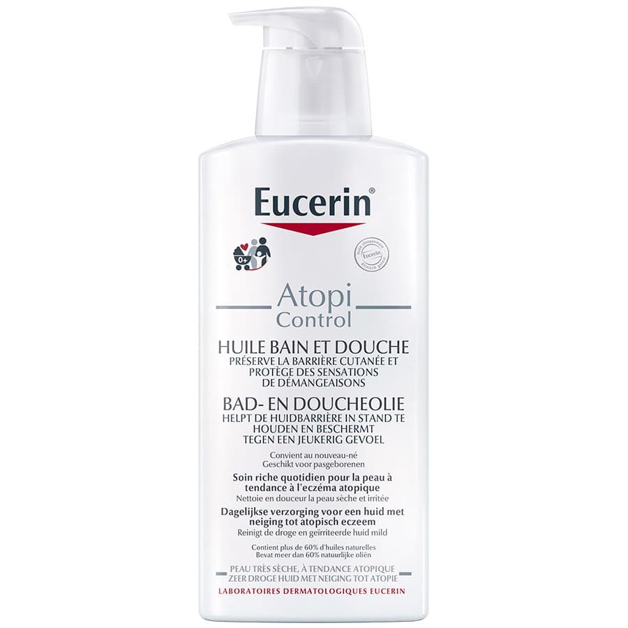 Eucerin AtopiControl bad- en douche olie herstelt de huidbarrière en beschermt tegen uitdroging.