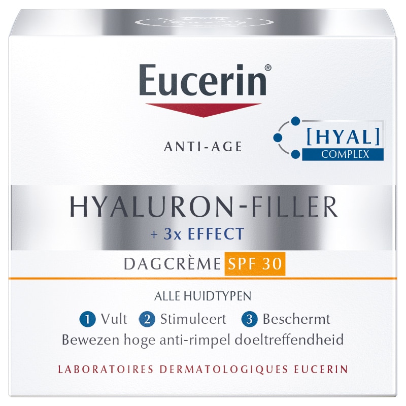 Eucerin Hyaluron-Filler Dag SPF30 treedt daarom op tegen zelfs de diepste rimpels. Met de exclusieve formule met Hyaluronzuur van hoog en laag moleculair gewicht en met Saponineglycine, dringt het verder in de epidermale huidlagen waar diepere rimpels ontstaan en ondersteunt de productie van Hyaluronzuur in de huidcellen om zelfs de diepste rimpels van binnenuit te vullen en zo voor een verjongde uitstraling zorgen.