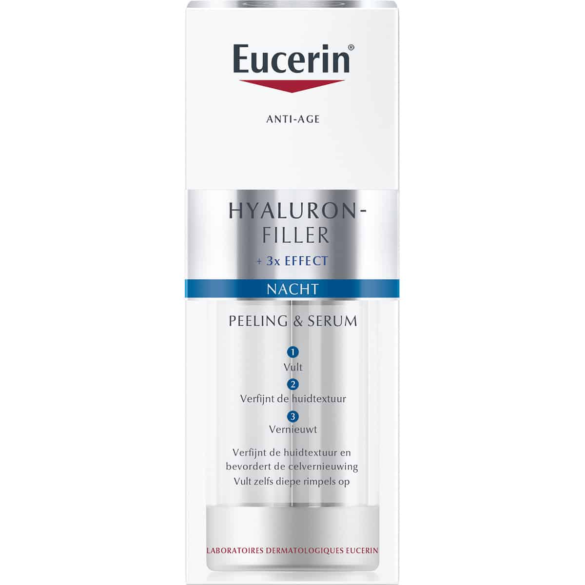 Eucerin Hyaluron-Filler Peeling & Serum Nacht stimuleert de celvernieuwing en helpt zelfs de diepste rimpels van binnenuit op te vullen.
