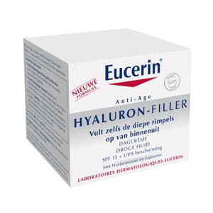 Eucerins unieke combinatie van Hyaluronzuur van hoog en laag moleculair gewicht, Glycine-saponine en Enoxolone biedt een gerichte aanpak om zelfs diepe rimpels zichtbaar op te vullen. Hyaluronzuur van hoog moleculair gewicht verbetert de hydratatie en maakt de buitenste huidlagen glad en Hyaluronzuur van laag moleculair gewicht, dat 40 keer kleiner is**, dringt dieper in de lagen van de opperhuid door, waar diepere rimpels ontstaan. De antioxidant Glycine-saponine ondersteunt de Hyaluronzuurproductie in de huidlaag waar de diepste rimpels zich vormen en beschermt tegen vrije radicalen. Enoxolone beschermt Hyaluronzuur in de huid tegen afbraak. Dexpanthenol ondersteunt het natuurlijke herstelproces van de huid gedurende de nacht.