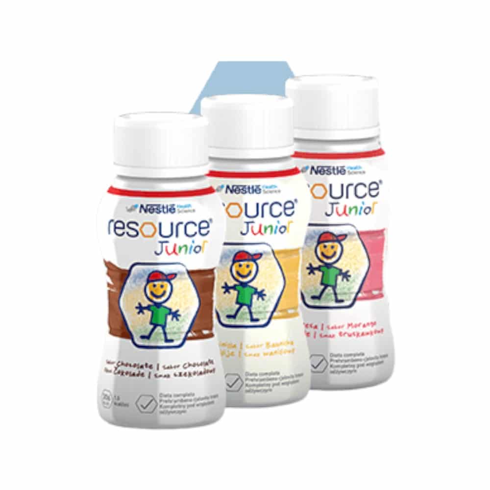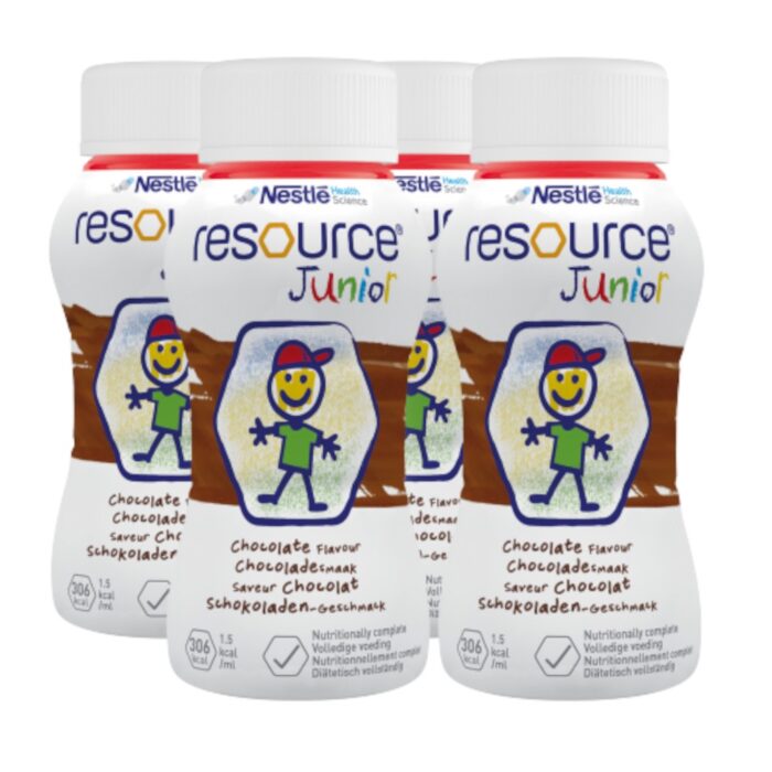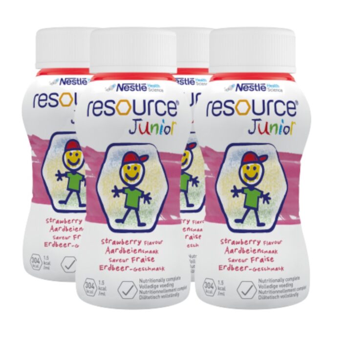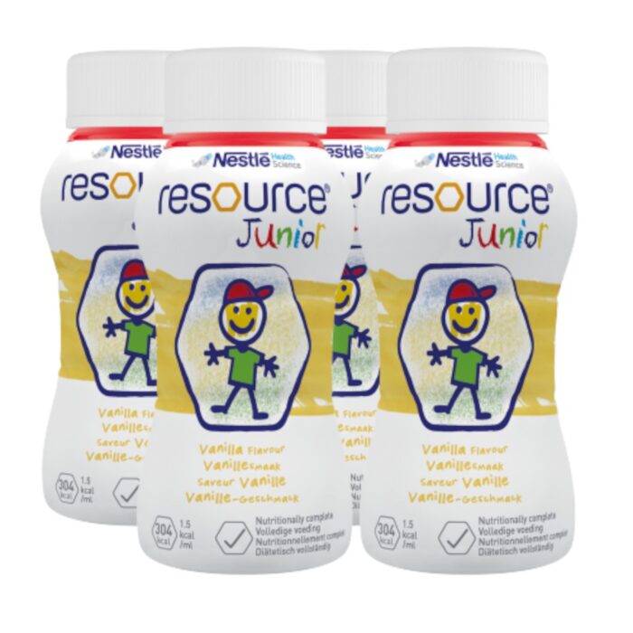 Nestlé Resource® Junior Drinkvoeding is een kant-en-klare, energierijke (1,5 kcal/ml) medische voeding speciaal ontwikkeld voor kinderen vanaf 1 jaar met (risico op) ondervoeding of een verhoogde energiebehoefte. Deze verpakking bevat 4 flesjes van 200 ml, klaar voor gebruik in huiselijke of klinische setting.