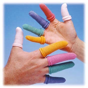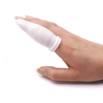 Dit vingerverband is gemaakt van rekbaar, luchtdoorlatend katoen en is uitgevoerd in het wit. Er bestaat ook een rubberen variant (vingercondooms).