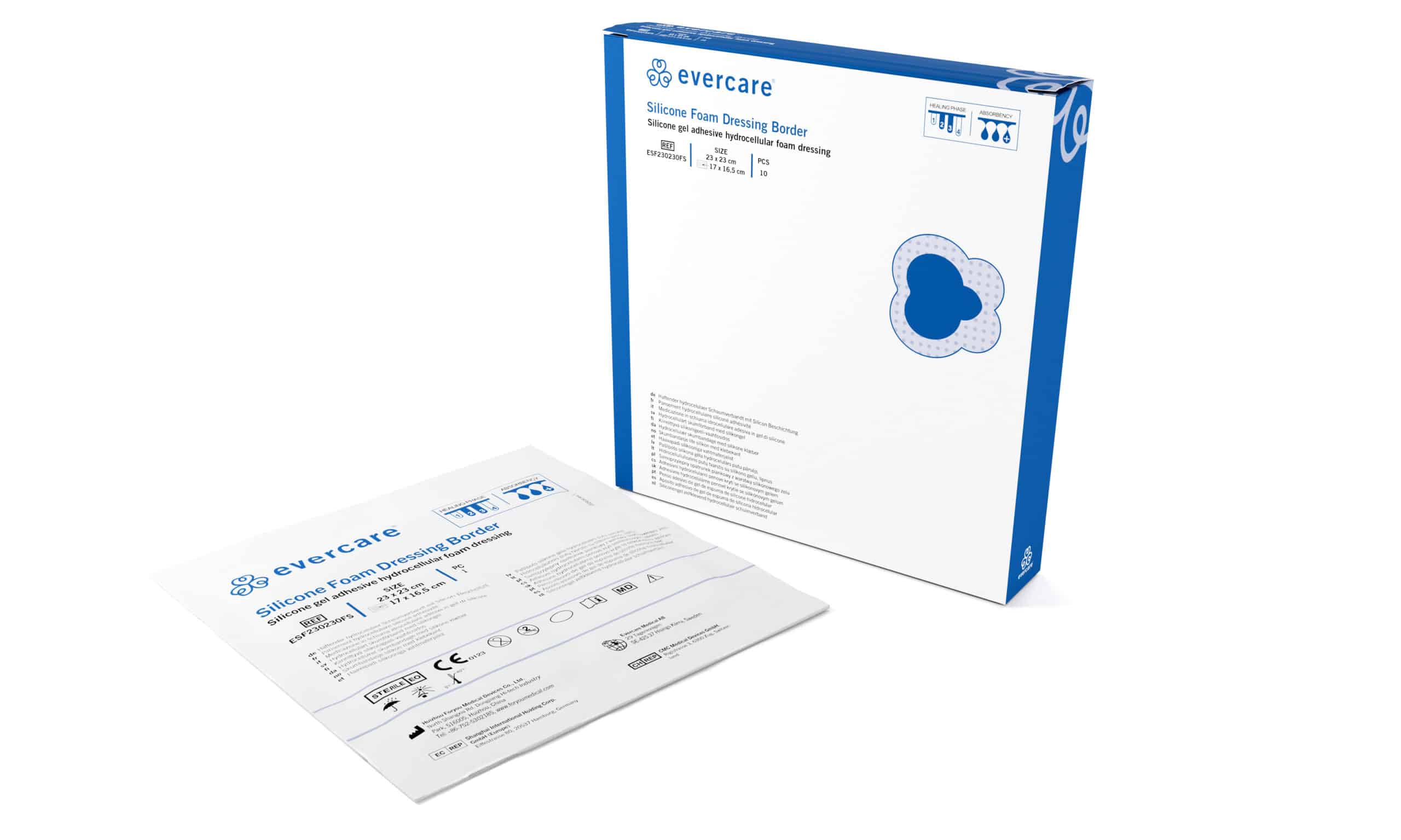 evercare® Siliconen schuimverband b order is een sterk absorberend verband dat exsudaat absorbeert en een vochtige wondomgeving behoudt.