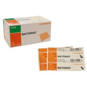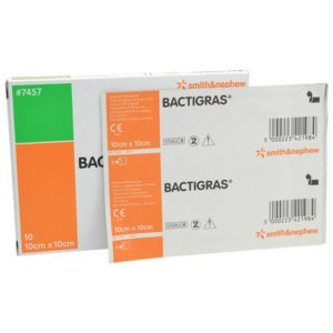 Bactigras is een gemedicineerd vet tuleverband dat de wond beschermt en verlicht door viskeuze exsudaten af te voeren, terwijl de niet-klevende pad de
