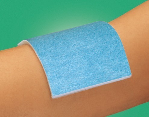 copolymeerfolie. De blauwe buitenlaag voorkomt dat wondvocht doorlekt en beschermt de kleding, terwijl deze tevens de wond beschermt tegen besmetting van
