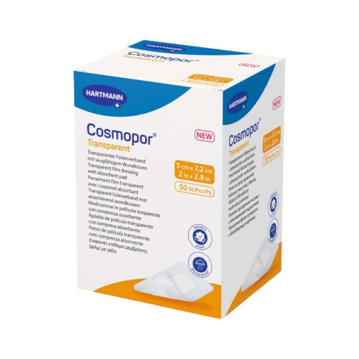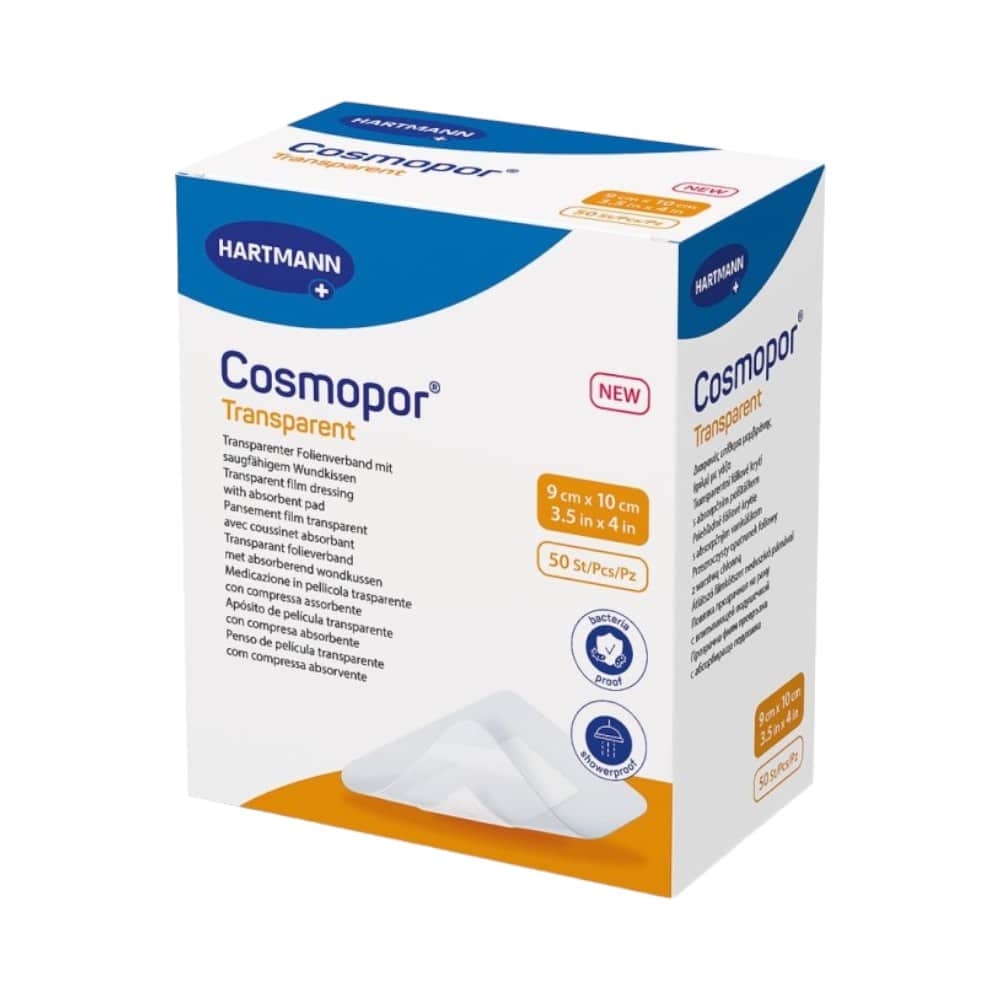 Cosmopor Transparant is een steriel, zelfklevend transparant folieverband met een absorberend wondkussen, gemaakt van een semipermeabele, waterbestendige