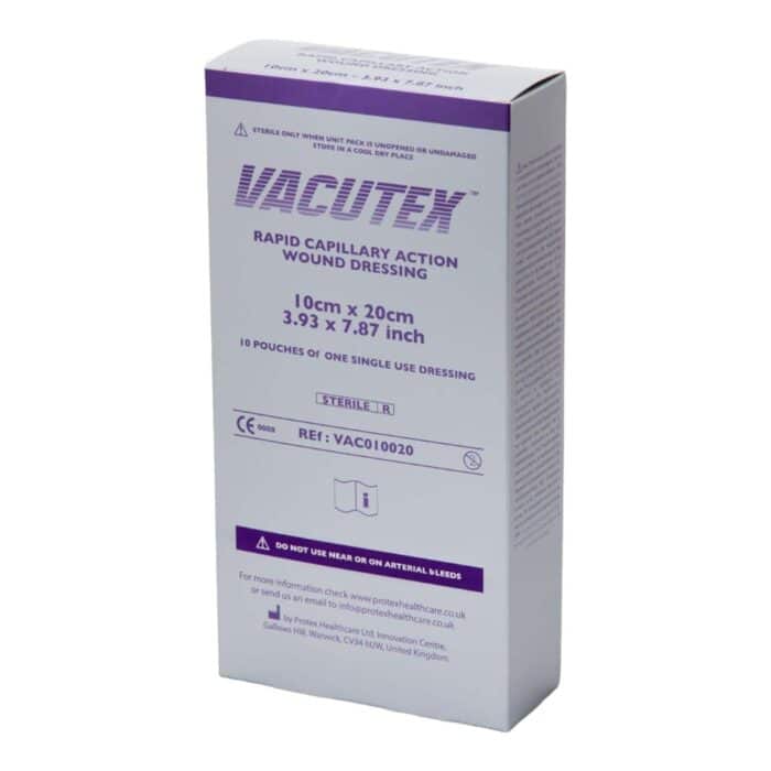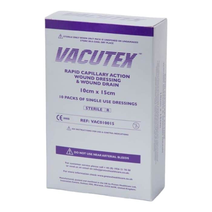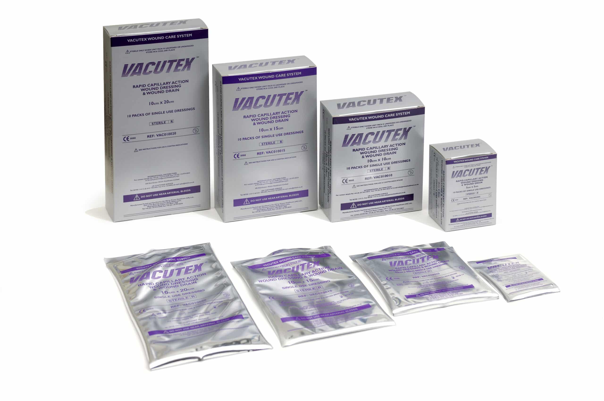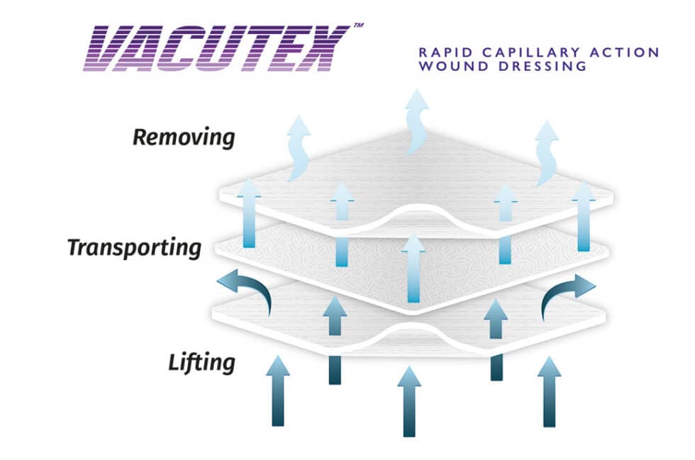 afgevoerd of verdampt via de buitenste laag. Dit zorgt voor een droge wondrand en bevordert genezing zonder de huid te verweken. Vacutex vermindert